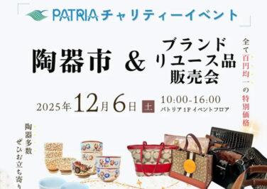 石川イベント能登南部開催 [12/6]陶器市&ブランドリユース品販売会がパトリアで開催(能登七尾) 『陶器市&ブランドリユース品販売会』が石川県七尾市の「パトリア」で2025年12月6日(土)に開催されます陶器市&ブラン... 2025.11.25 石川イベント能登南部開催