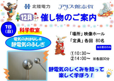 石川イベント能登南部開催 [12/7]科学教室がアリス館志賀で開催(能登志賀町) 『科学教室・科学工作』が石川県羽咋郡志賀町の「アリス館志賀」で2025年12月7日(日)に開催されます科学教室@アリス館... 2025.11.26 石川イベント能登南部開催