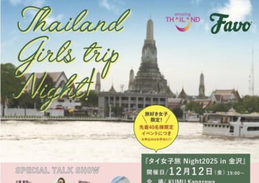 石川イベント金沢開催 [12/12]タイ女子旅Night2025in金沢がKUMU Kanazawa by THE SHARE HOTELSで開催(金沢) “タイを旅する気分” を味わえる『タイ女子旅 Night 2025 in 金沢』が石川県金沢市の「KUMU Kanaza... 2025.12.03 石川イベント金沢開催