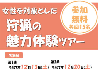 白山・能美石川イベント開催 [12/13,20]令和7年度女性を対象とした狩猟の魅力体験ツアーが白山市で開催 『令和7年度 女性を対象とした狩猟の魅力体験ツアー』が石川県白山市で2025年12月13日(土)、12月20日(土)の2... 2025.12.03 白山・能美石川イベント開催