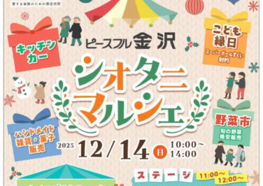 石川イベント金沢開催 [12/14]シオタニマルシェinピースフル金沢開催(金沢) 『シオタニマルシェinピースフル金沢』が石川県金沢市の「ピースフル金沢」で2025年12月14日(日)に開催されますシオ... 2025.12.03 石川イベント金沢開催