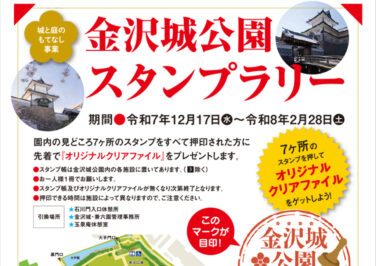 石川イベント金沢開催 [12/17-2/28]金沢城公園スタンプラリー開催(金沢) 『金沢城公園スタンプラリー』が石川県金沢市の「金沢城公園」で2025年12月17日(水)から2026年2月28日(土)ま... 2025.12.17 石川イベント金沢開催