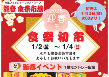 石川イベント能登南部開催 [1/2-4]能登食祭初市&食祭神社が能登食祭市場(七尾フィッシャーマンズワーフ)で開催(能登七尾) 『能登食祭初市&食祭神社』が石川県七尾市の「能登食祭市場(七尾フィッシャーマンズワーフ)」で2026年1月2日(金)から... 2025.12.15 石川イベント能登南部開催