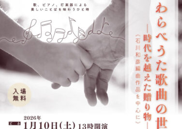 石川イベント能登南部開催 [1/10]わらべううた歌曲の世界/–時代を超えた贈り物–vol.3が能登食祭市場で開催(能登七尾) 『わらべううた歌曲の世界/–時代を超えた贈り物–vol.3』が石川県七尾市の「能登食祭市場(七尾フィッシャーマンズワーフ... 2025.12.15 石川イベント能登南部開催