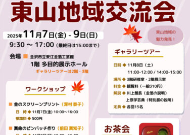 石川イベント金沢開催 [11/7-9]東山地域交流会が金沢安江金箔工芸館で開催(金沢) 『東山地域交流会』が石川県金沢市の「金沢安江金箔工芸館 1階 多目的展示ホール」で2025年11月7日(金)から11月9... 2025.11.06 石川イベント金沢開催