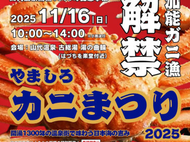 加賀石川イベント開催 [11/16]やましろカニまつりが山代温泉古総湯周辺で開催(加賀市) 『やましろカニまつり』が石川県加賀市の「山代温泉 古総湯周辺 湯の曲輪」で2025年11月16日(日)に開催されますやま... 2025.11.06 加賀石川イベント開催