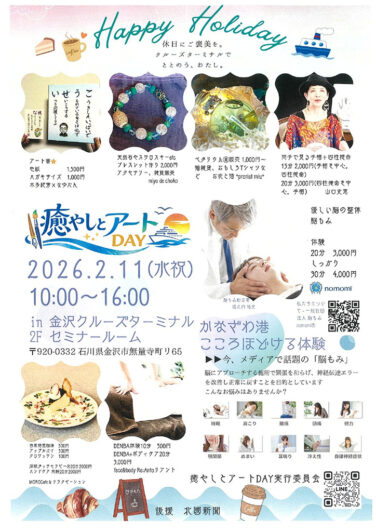 石川イベント金沢開催 [2/11]癒しとアートDAYが金沢港クルーズターミナルで開催(金沢) 『癒しとアートDAY』が石川県金沢市の「金沢港クルーズターミナル」で2026年2月11日(水祝)に開催されます癒しとアー... 2026.02.03 石川イベント金沢開催
