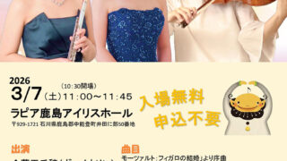 石川イベント能登南部開催 [2/11]トワイライトクラシックコンサートがLAKUNAはくいで開催(能登羽咋) 『トワイライトクラシックコンサート』が石川県羽咋市の「LAKUNAはくい」で2026年2月11日(水祝)に開催されますト... 2026.02.08 石川イベント能登南部開催