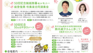 白山・能美石川イベント開催 [3/14]第50回全日本競歩能美大会・プレイベント〜のみきょうほワクワクデー〜が根上総合文化会館で開催(能美市) 『第50回全日本競歩能美大会・プレイベント〜のみきょうほワクワクデー〜』が石川県能美市の「根上総合文化会館」で2026年... 2026.03.10 白山・能美石川イベント開催