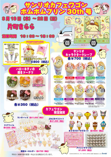 石川イベント金沢開催 [3/19-22]サンリオカフェワゴン ポムポムプリン30th号が片町きららに登場!(金沢) 『サンリオカフェワゴン ポムポムプリン30th号』が石川県金沢市の「片町きらら」に2026年3月19日(木)から3月22... 2026.03.10 石川イベント金沢開催