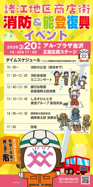 石川イベント金沢開催 [3/20]諸江地区商店街『消防&能登復興イベント』及び『能登を元気に!共に歩む市第三弾』がアルプラザ金沢で開催(金沢) 輪島朝市組合、御陣乗太鼓保存会、諸江地区商店街、アル・プラザ金沢、コラボレーション企画!『消防&能登復興イベント』と『能... 2026.03.16 石川イベント金沢開催