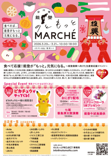 石川イベント能登北部開催 [3/15]能登まるごと味覚まつりがのと里山空港で開催(能登輪島) 『能登まるごと味覚まつり』が石川県輪島市の「のと里山空港」で2026年3月15日(日)に開催されます能登まるごと味覚まつ... 2026.03.07 石川イベント能登北部開催