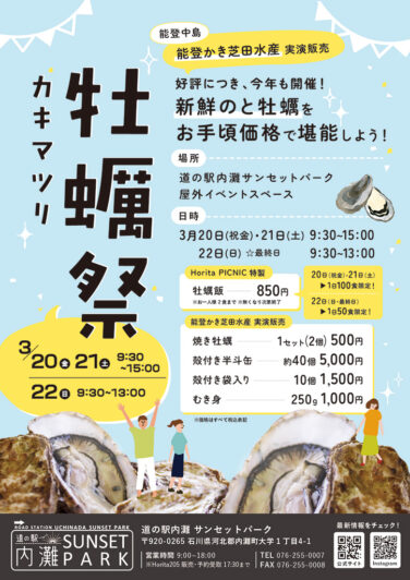 石川イベント能登南部開催 [3/20-22]千里浜かき祭りが道の駅 のと千里浜で開催(能登羽咋) 『千里浜かき祭り』が石川県羽咋市の「道の駅 のと千里浜」で2026年3月20日(金祝)から3月22日(日)まで開催されま... 2026.03.10 石川イベント能登南部開催
