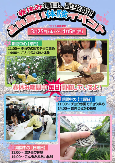 白山・能美石川イベント開催 [3/25-4/5]春休み毎日、昆虫館!ふれあい体験イベントが石川県ふれあい昆虫館で開催(白山市) 『春休み毎日、昆虫館!ふれあい体験イベント』が石川県白山市の「石川県ふれあい昆虫館」で2026年3月25日(水)から4月... 2026.03.26 白山・能美石川イベント開催