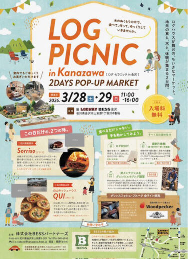 石川イベント金沢開催 [3/28-29]ログハウスが舞台のちいさなマーケット『LOG PICNIC in Kanazawa』がBESS金沢で開催(金沢) ログハウスが舞台のちいさなマーケット『LOG PICNIC in Kanazawa』が石川県金沢市の「旧LOGWAY B... 2026.03.27 石川イベント金沢開催