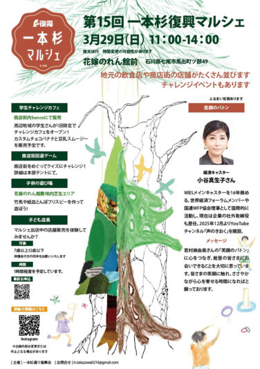 石川イベント能登南部開催 [3/29]第15回一本杉復興マルシェが花嫁のれん館前で開催(能登七尾) 『第15回一本杉復興マルシェ』が石川県七尾市の「花嫁のれん館前」で2026年3月29日(日)に開催されます第15回一本杉... 2026.03.27 石川イベント能登南部開催