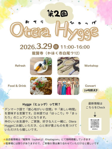 津幡・かほく石川イベント開催 [3/29]マッサージ・ワークショップ・クラフト雑貨が楽しめる『第二回Otera Hygge(おてらひゅっげ)』が龍賢寺で開催(かほく市) 『第二回Otera Hygge(おてらひゅっげ)』が石川県かほく市の「龍賢寺」で2026年3月29日(日)に開催されます... 2026.03.27 津幡・かほく石川イベント開催