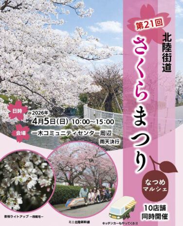 白山・能美石川イベント開催 [4/5]第21回北陸街道さくらまつりが一木コミュニティセンター周辺で開催(白山市) 『第21回北陸街道さくらまつり』が石川県白山市の「一木コミュニティセンター周辺」で2026年4月5日(日)に開催されます... 2026.04.03 白山・能美石川イベント開催