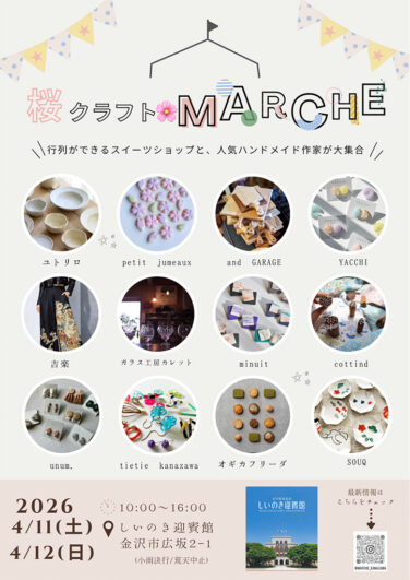 石川イベント金沢開催 [4/11-12]桜クラフトMARCHE(マルシェ)がしいのき迎賓館で開催(金沢) 『桜クラフトMARCHE(マルシェ)』が石川県金沢市の「しいのき迎賓館」で2026年4月11日(土)、4月12日(日)に... 2026.04.01 石川イベント金沢開催