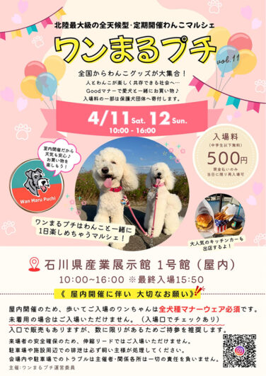 石川イベント金沢開催 [4/11-12]北陸最大級わんこマルシェ『ワンまるプチvol.11』が石川県産業展示館で開催(金沢) 北陸最大級のわんこマルシェ『ワンまるプチ vol.11』が石川県金沢市の「石川県産業展示館1号館」で2026年4月11日... 2026.04.01 石川イベント金沢開催