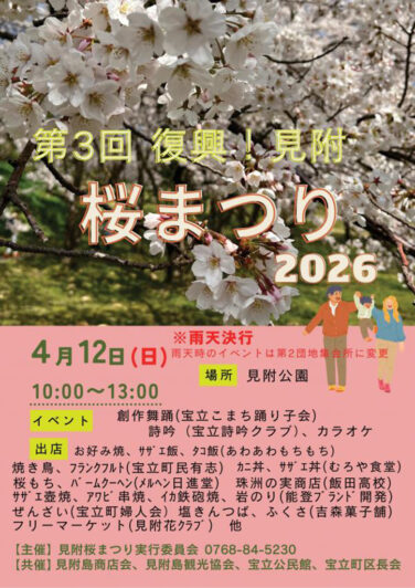 石川イベント能登北部開催 [4/12]第3回復興!見附桜まつり2026が見附公園地内特設会場で開催(能登珠洲) 『第3回 復興!見附桜まつり2026』が石川県珠洲市の「見附公園地内特設会場」で2026年4月12日(日)に開催されます... 2026.04.01 石川イベント能登北部開催