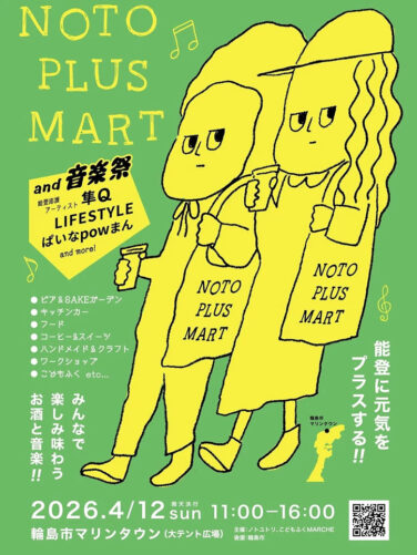 石川イベント能登北部開催 [4/12]NOTO PLUS MART+音楽祭が輪島市マリンタウンで開催(能登輪島) 『NOTO PLUS MART+音楽祭』が石川県輪島市の「輪島市マリンタウン」で2026年4月12日(日)に開催されます... 2026.04.01 石川イベント能登北部開催