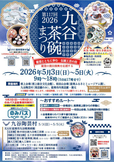 白山・能美石川イベント開催 [5/2-5]第19回上出長右衛門窯 窯まつり開催(能美市) 『第19回上出長右衛門窯 窯まつり』が石川県能美市の「上出長右衛門窯」で2026年5月2日(土)から5月5日(火祝)まで... 2026.04.29 白山・能美石川イベント開催