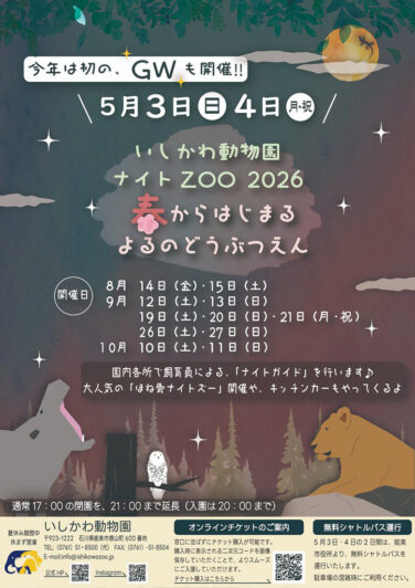 石川イベント週末開催イベント開催 石川県の週末イベント(5/1-5/6) 石川県で週末、2026年5月1日(金)から5月6日(水振)までのゴールデンウィーク期間中に開催されるイベント情報をまとめ... 2026.04.27 2026.04.29 石川イベント週末開催イベント開催