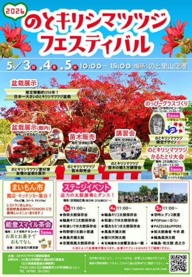 石川イベント能登北部開催 [4/29]第1回“能登の絆”フェスティバルがなぎさガーデンで開催(能登穴水) 『第1回“能登の絆”フェスティバル』が石川県鳳珠郡穴水町の「なぎさガーデン地内」で2026年4月29日(水祝)に開催され... 2026.04.26 石川イベント能登北部開催