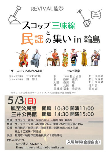 石川イベント能登北部開催 [5/2]スコップ三味線と民謡の集いin珠洲が蛸島公民館とすずっこひろばで開催(能登珠洲) 『スコップ三味線と民謡の集いin珠洲』が石川県珠洲市の「蛸島公民館」と「すずっこひろば」の2ヶ所で2026年5月2日(土... 2026.04.27 石川イベント能登北部開催