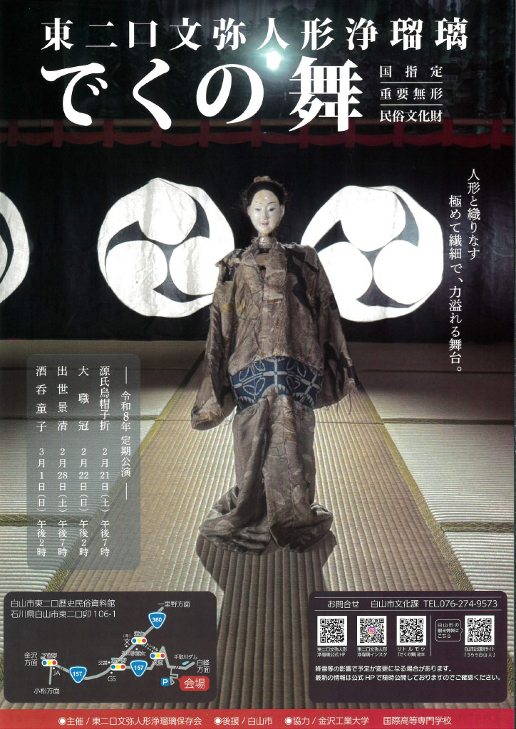 『東二口人形浄瑠璃「でくの舞」』が石川県白山市の「白山市東二口歴史民俗資料館」で2026年2月21日(土)、2月22日(日)、2月28日(土)、3月1日(日)に開催されます