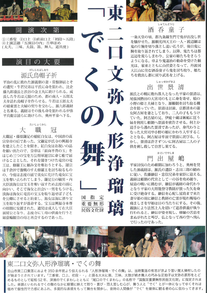 350余年前から伝わる、東二口地区に伝承されてきた文弥人形浄瑠璃「でくの舞」は、同地の若者が京都・大阪に赴き、習い覚えて持ち帰ったものと伝えられています
