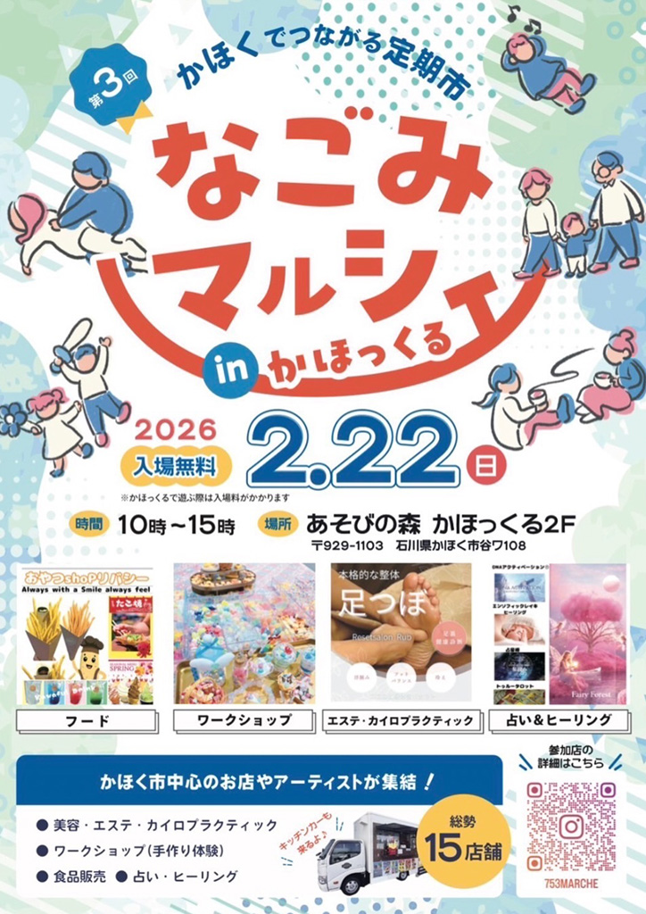 2月22日(日)に石川県かほく市の「あそびの森 かほっくる」にて『第3回なごみマルシェ』が開催されます