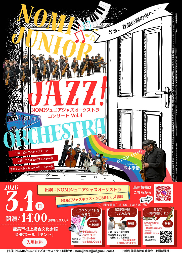 3月1日(日)に石川県能美市の「能美市根上総合文化会館タント」にて『NOMIジュニアジャズオーケストラコンサート Vol.4』が開催されます