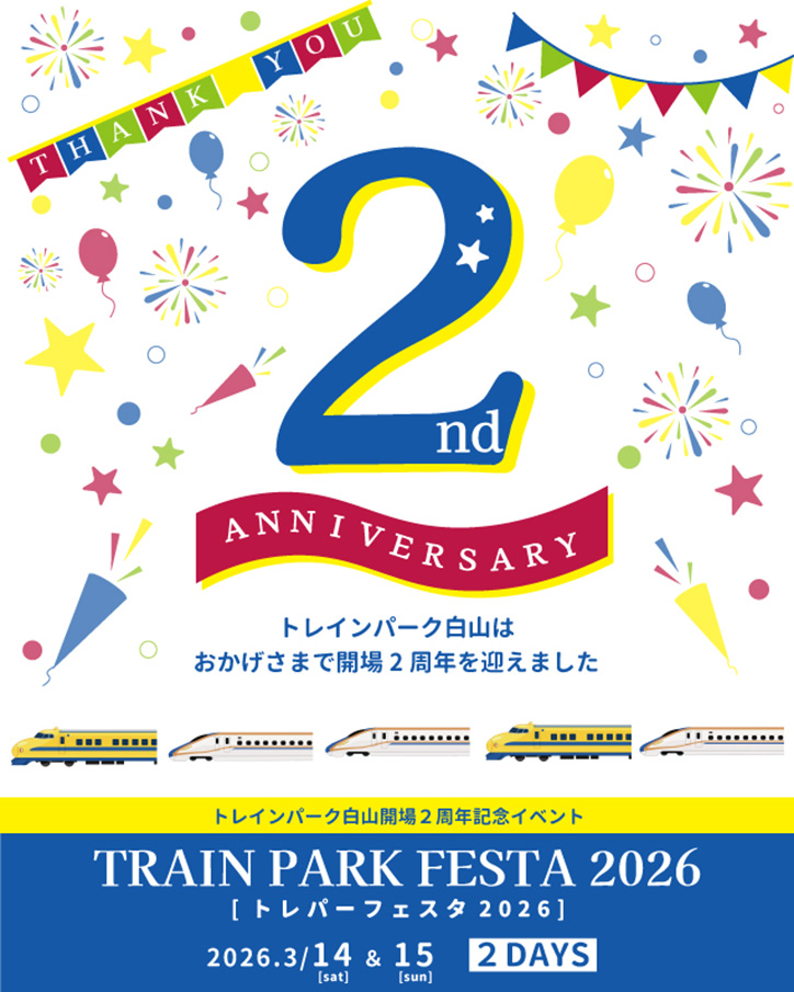 3月14日(土)、3月15日(日)に石川県白山市の「トレインパーク白山」にて、開業2周年記念イベント『トレパーフェスタ2026』が開催されます