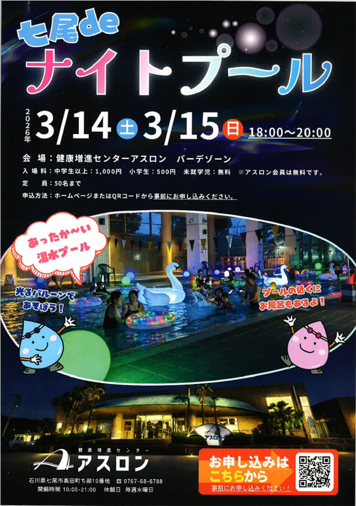 3月14日(土)、3月15日(日)に石川県七尾市の「健康増進センターアスロン」にて『七尾 de ナイトプール』が開催されます