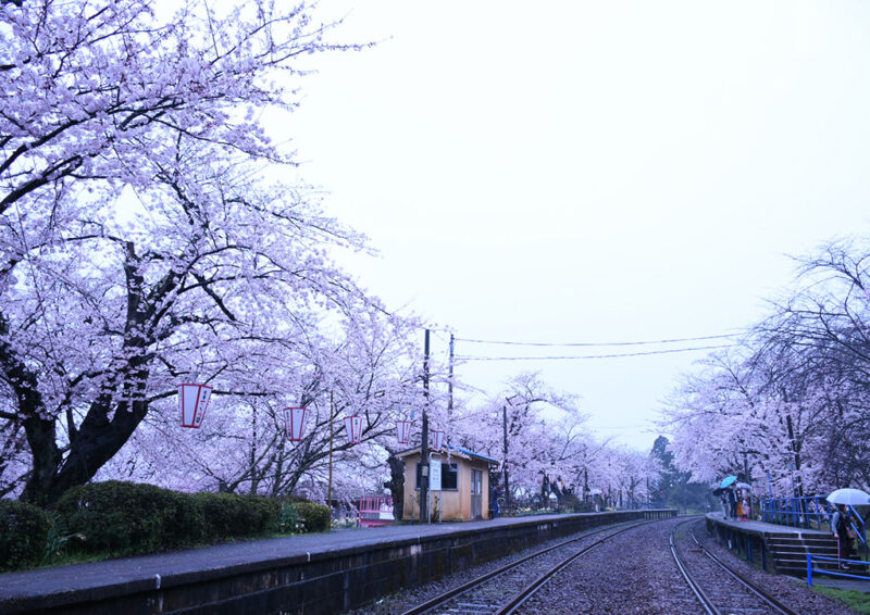 『能登さくら駅(能登鹿島駅)』は、春になると線路を挟んで数十本のソメイヨシノが両ホームから構内を覆うように咲き誇り、見事なサクラの花のトンネルができます