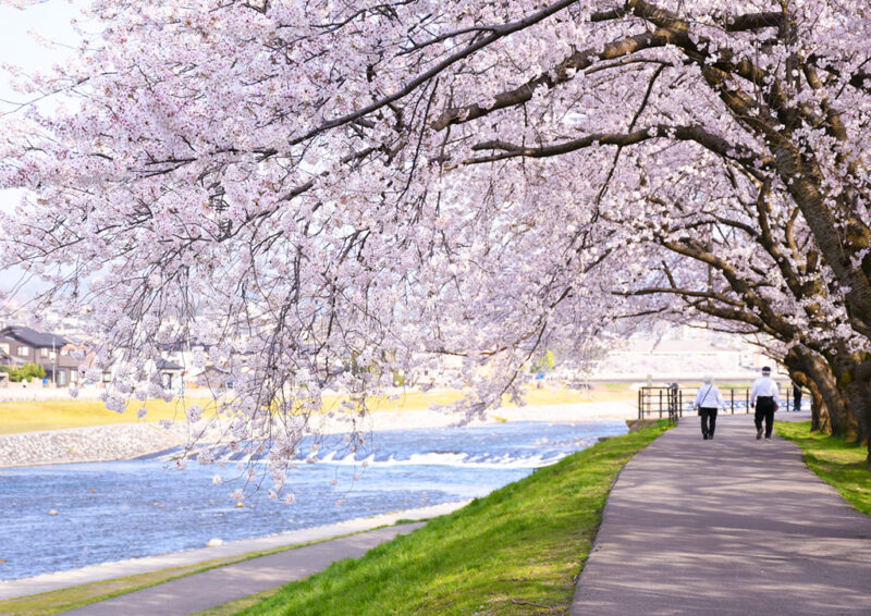 両岸には遊歩道が整備されていて、春には川辺に続く桜並木を散策しながら楽しめます