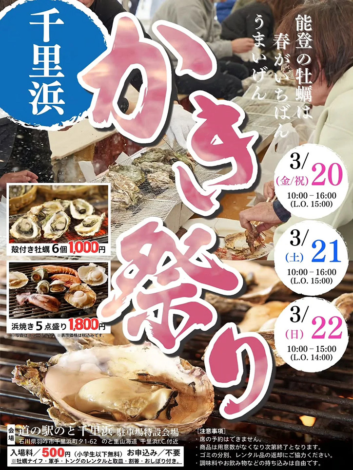 3月20日(金祝)から3月22日(日)まで石川県羽咋市の「道の駅 のと千里浜」にて『千里浜かき祭り』が開催されます