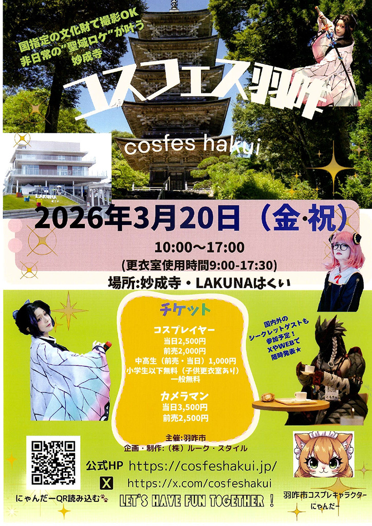 『コスフェス羽咋2026』が石川県羽咋市の「妙成寺&LAKUNAはくい」で2026年3月20日(金祝)に開催されます