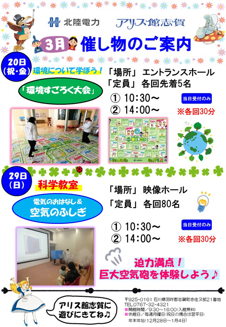 [3/20,29]『環境すごろく大会』&科学教室『電気のおはなし&空気のふしぎ』がアリス館志賀で開催(能登志賀町)