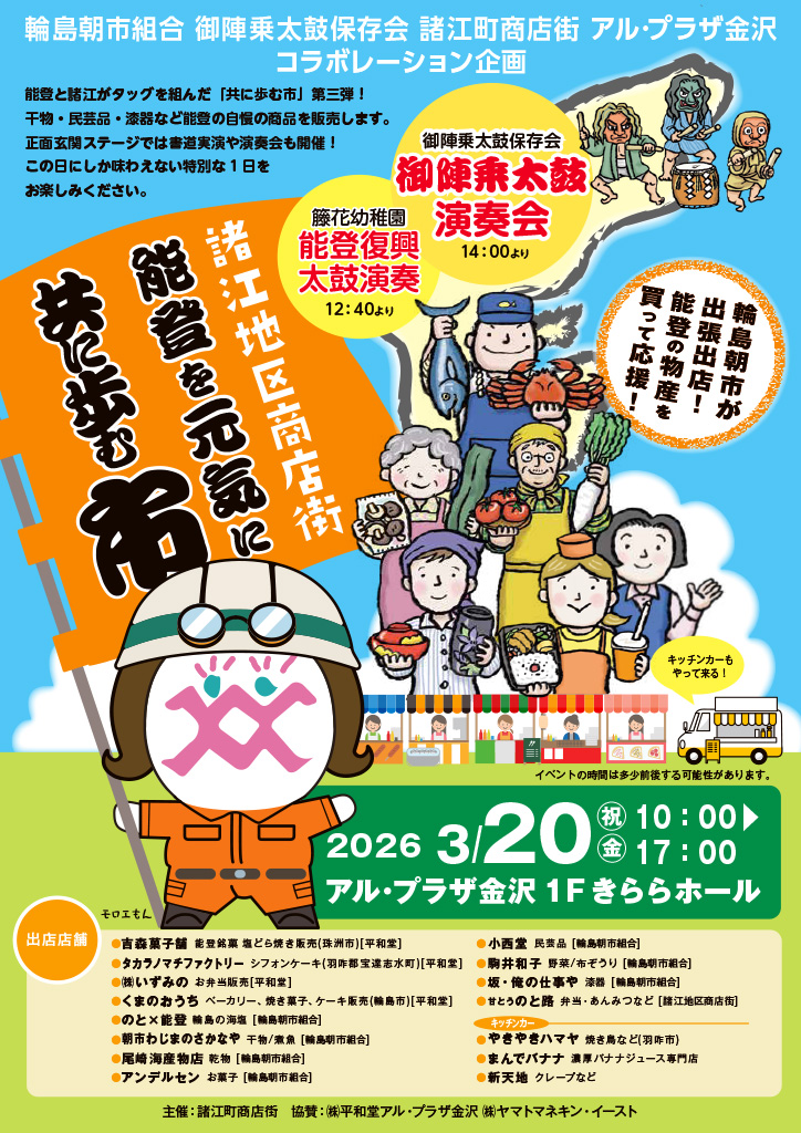 輪島朝市組合、御陣乗太鼓保存会、諸江地区商店街、アル・プラザ金沢、コラボレーション企画!
