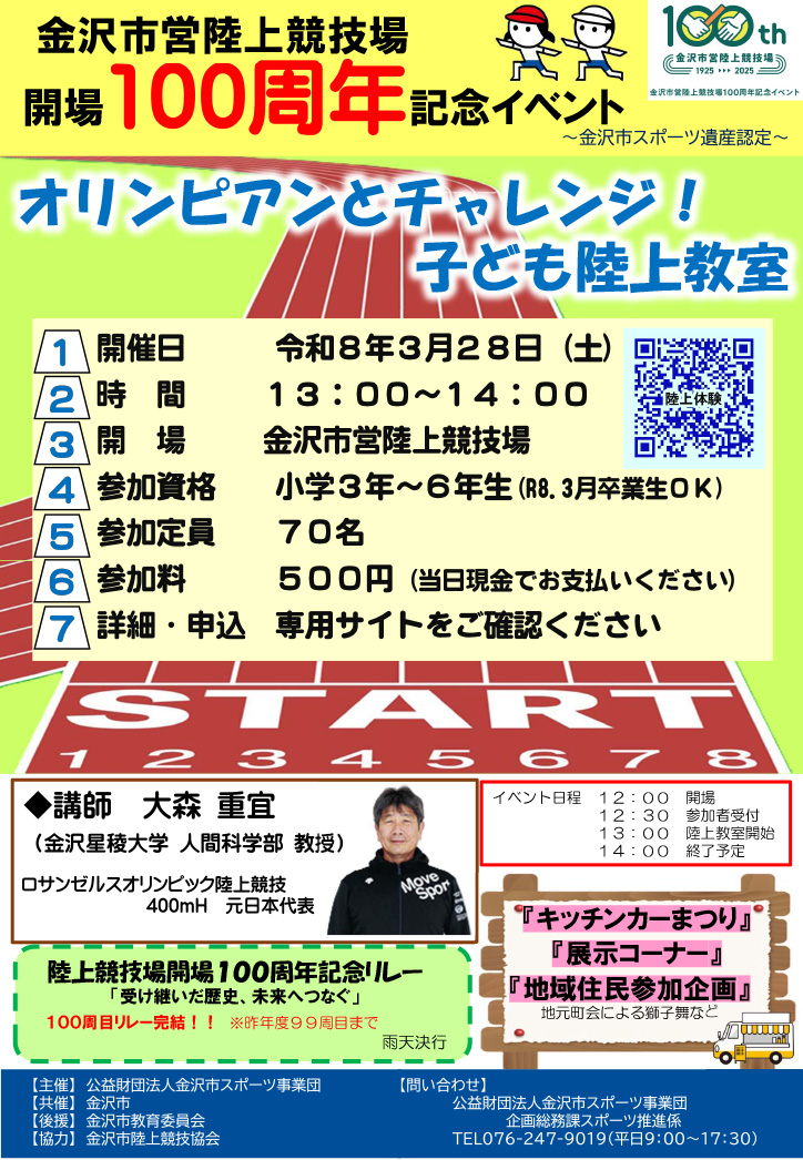 『金沢市営陸上競技場 開場100周年記念イベント』が石川県金沢市の「金沢市営陸上競技場」で2026年3月28日(土)に開催されます