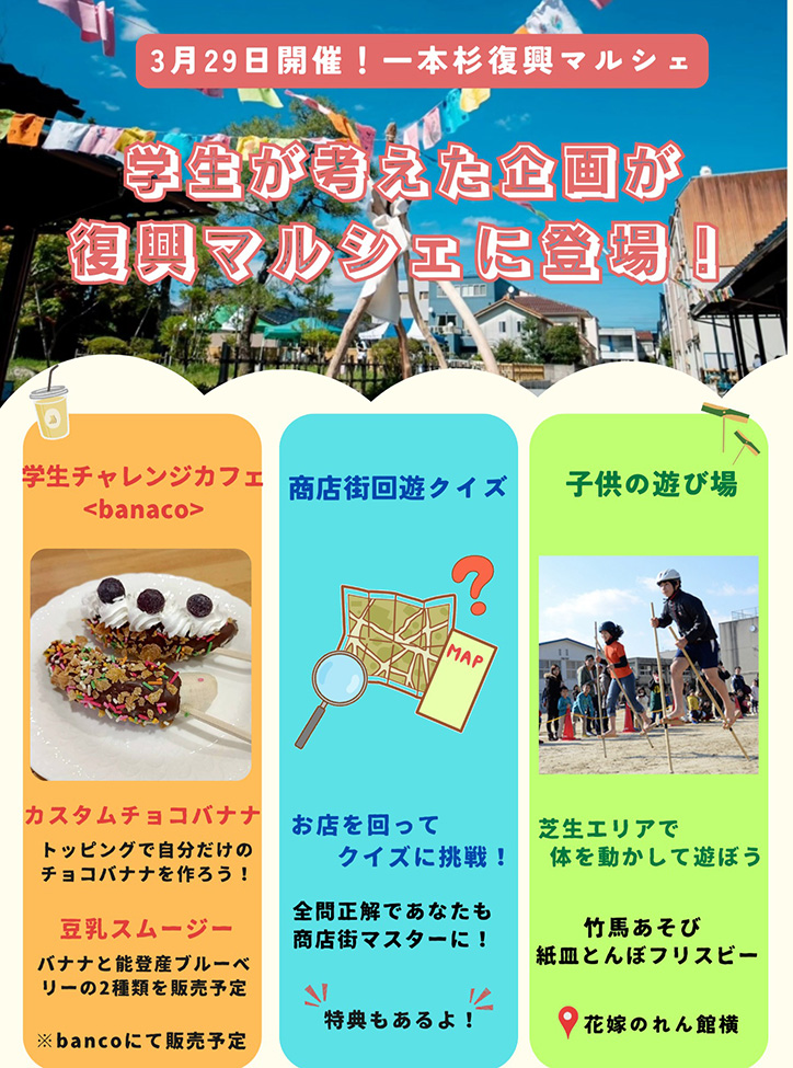 3月29日(日)に石川県七尾市の「花嫁のれん館前」にて『第15回一本杉復興マルシェ』が開催されます