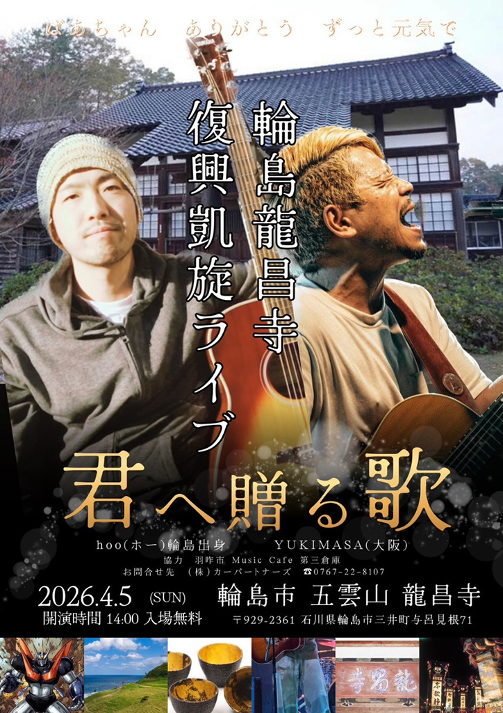 『能登地震復興支援ライブ in輪島~復興凱旋~』が石川県輪島市の「五雲山 龍昌寺」で2026年4月5日(日)に開催されます
