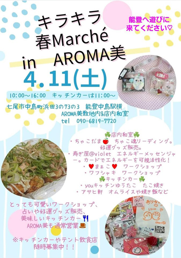 4月11日(土)に石川県七尾市の「Cafe AROMA美」にて『キラキラ春Marche in AROMA美』が開催されます