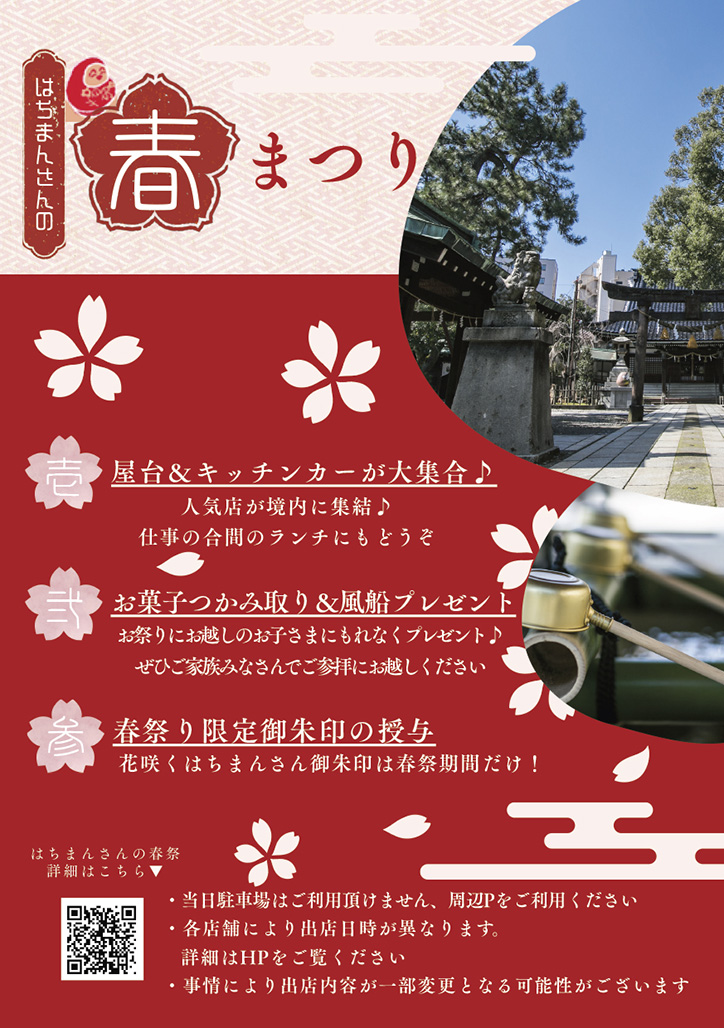 平日となりますが、仕事のお昼休みのランチや、学校帰りのお子様たちと『はちまんさんの春まつり(春季例祭)』へ足を運んでみませんか