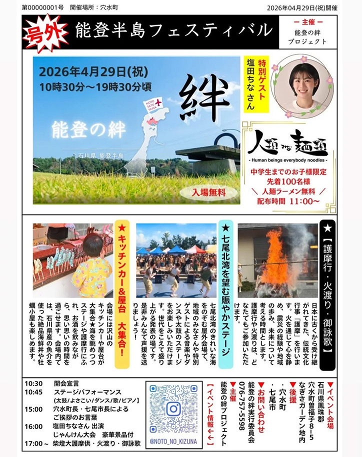 『第1回“能登の絆”フェスティバル』が石川県鳳珠郡穴水町の「なぎさガーデン地内」で2026年4月29日(水祝)に開催されます