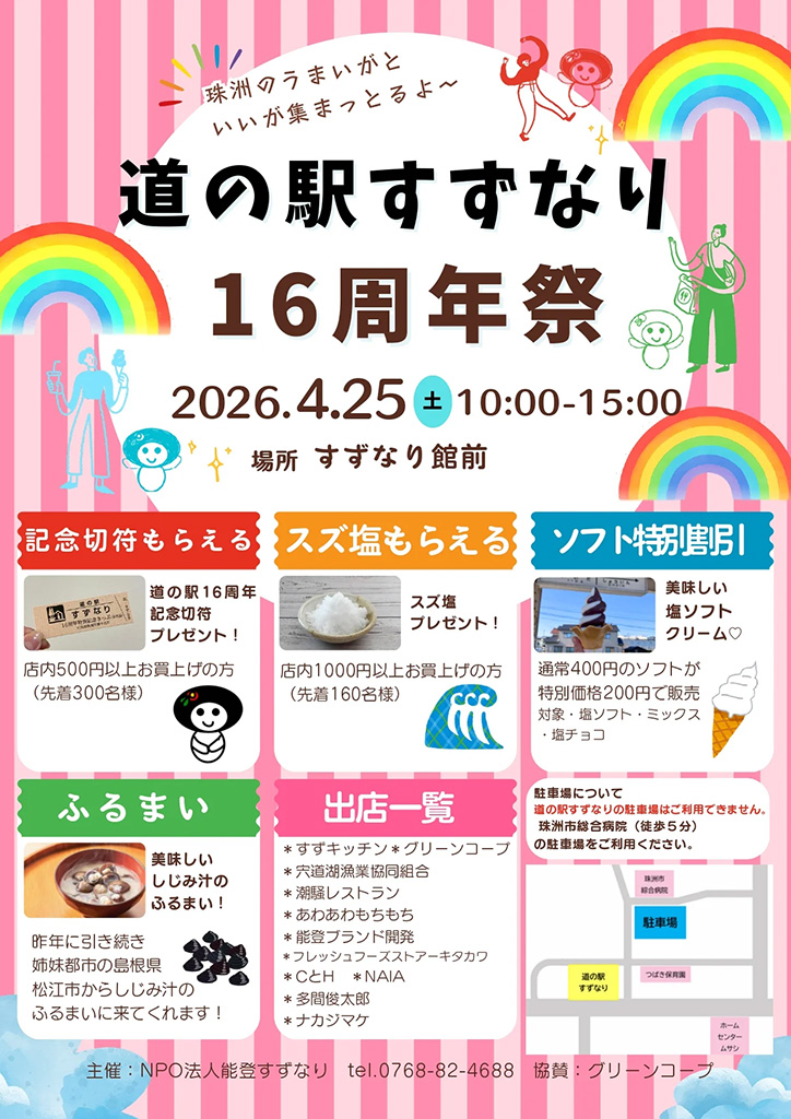 珠洲のうまいといいが集まった『道の駅すずなり16周年祭』が石川県珠洲市の「道の駅すずなり」にて、2026年4月25日(土)に開催されます