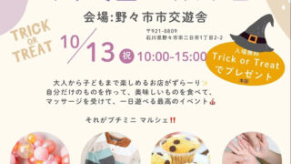 石川県のこつぶでピリリな作家&個人商店のべ175店ほどが、能登・金沢・加賀・白山など石川県各地から「本多の森公園」と「しいのき緑地」につどいます